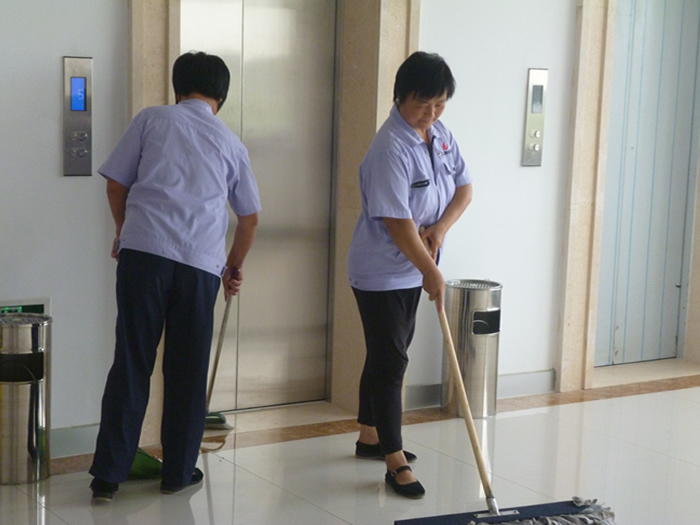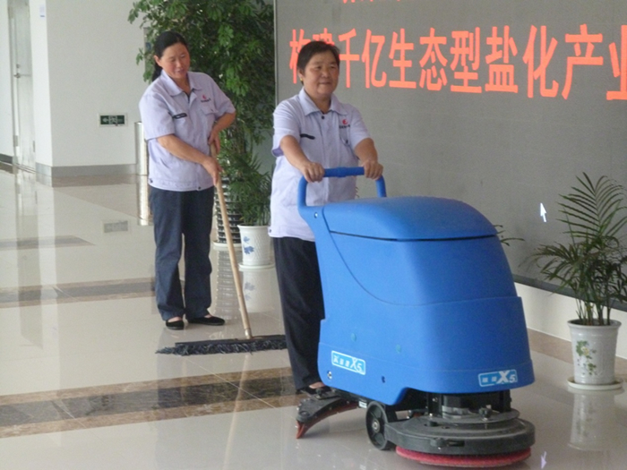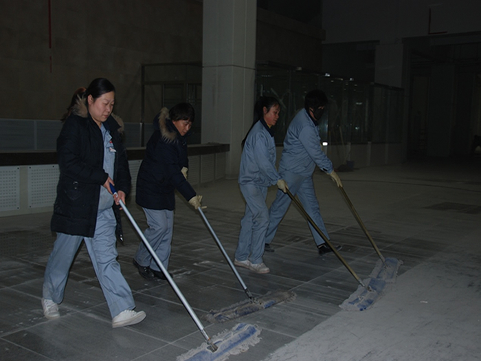 6、 地面清洗:著重處理開荒保潔遺留下的漆點、膠點等污漬,然后用清洗機對地面進行清洗。