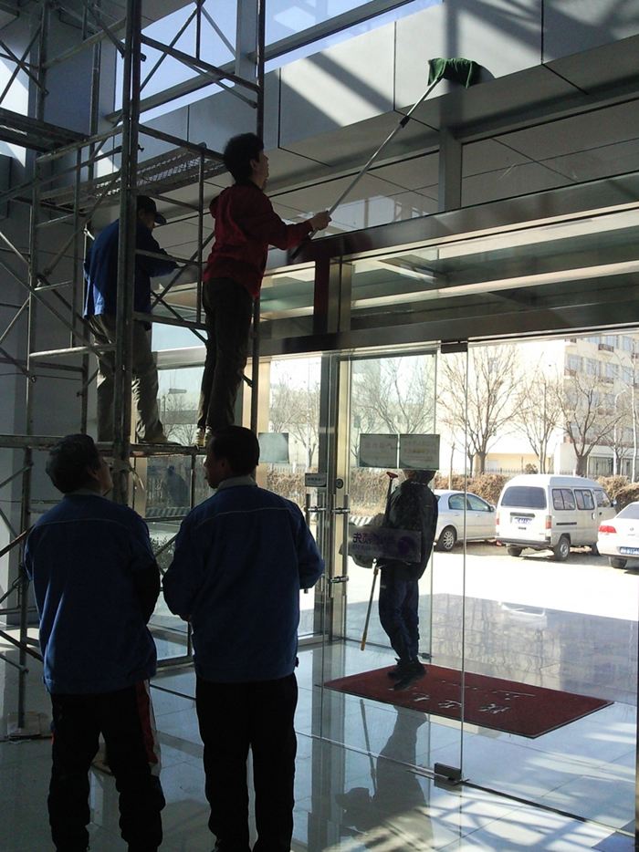 1、 玻璃清洗:先用毛察沾上稀釋后的玻璃水溶液,均勻的從上到下涂抹玻璃,污漬嚴重的地方多涂抹幾次,然后用玻璃刮刀從上到下刮干凈,再用干毛巾擦凈框戶上留下的水痕,玻璃上的水痕用機皮擦拭干凈。